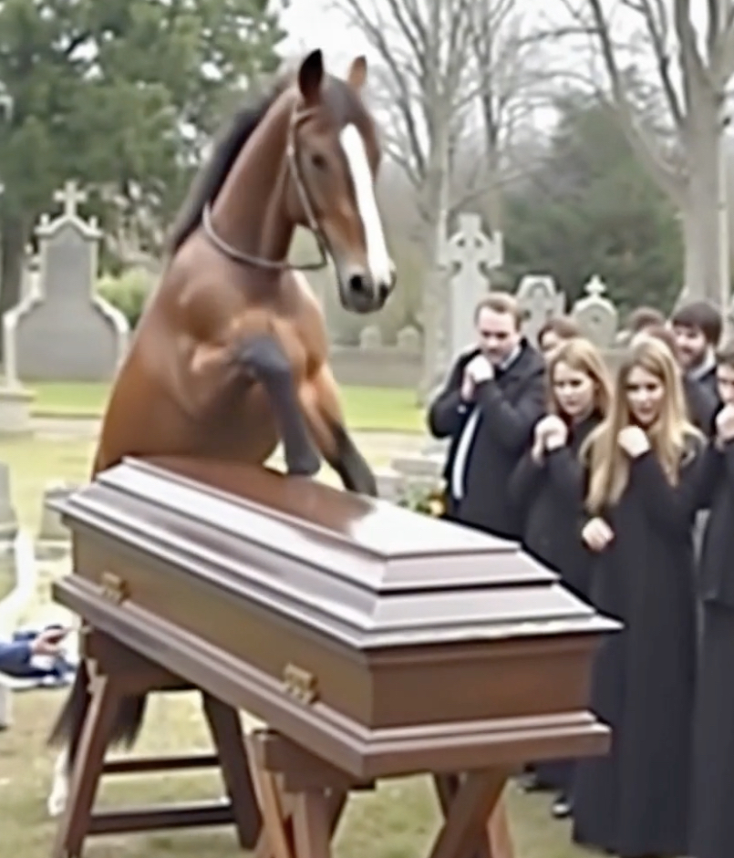 Now, she was a tempest in full fury, her hooves striking the ground with a rhythm that echoed through the silent, narrow streets. Her mane flew back like a banner, and her eyes glistened with something that looked almost like defiance. As she reached the coffin, the crowd parted as if commanded by an unseen hand. There was no restraining her; she was a force of nature, unstoppable and resolute.