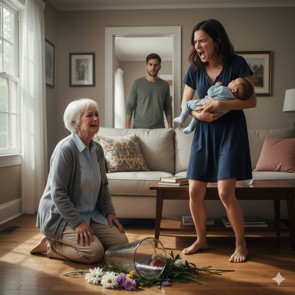 I rushed toward the living room, my heart racing. What I saw made my blood turn to ice. Martha was on the ground, her face flushed with pain and embarrassment. The flowers she’d been carrying were scattered across the hardwood floor, water spreading in a dark stain. Everly stood over her, holding our grandson, her face twisted with disgust.