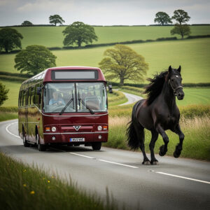 Out of the trees, as if from nowhere, a horse ran onto the road. Black, shiny, clearly not wild — well-groomed, with a thick mane and soft eyes. It easily caught up with the bus, running right beside it, not falling behind even a meter.
