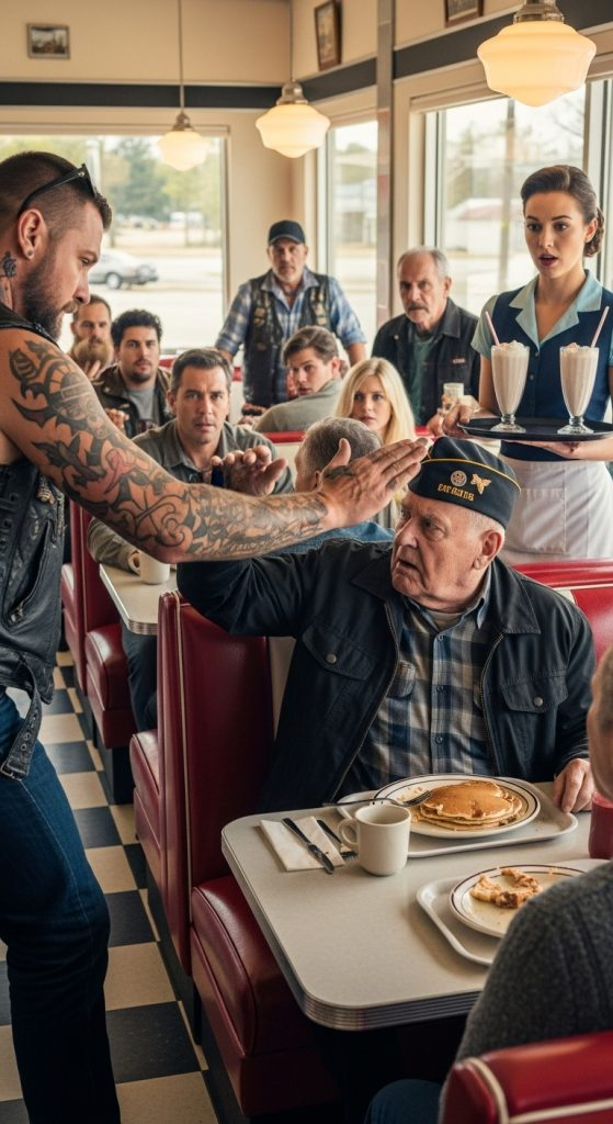 The answer, spoken with unshaken composure, only fueled the biker’s arrogance. Without warning, Cole’s hand flew across the table, striking Harold hard across the cheek. The sound of the slap cracked through the diner. Harold’s cap tumbled to the floor, and his coffee spilled across the table. A waitress gasped and pressed a hand to her mouth, a mother shielded her child’s eyes, and the family at the booth went silent. Cole chuckled, proud of his display. “Should’ve stayed in the past, soldier,” he mocked.