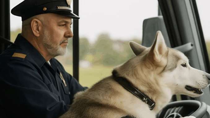 The husky’s ears shot up. Its gaze became tense, as if it had picked up a faint but alarming signal. At first, the dog whined softly, then it suddenly jumped up and rushed toward the bus driver.