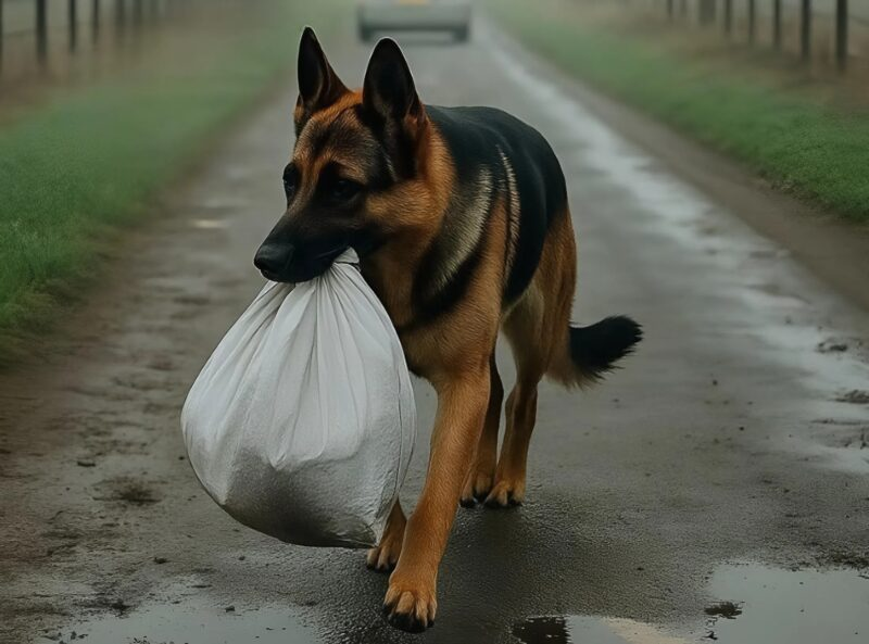 The woman stopped, pressed herself against the roadside, and tried not to disturb the animal. She watched in surprise as the Shepherd approached the corner. Suddenly, a car braked next to the dog. The driver didn’t even turn off the engine: he simply opened the door, skillfully grabbed the bag from the dog’s mouth, and drove off immediately, disappearing around the corner.