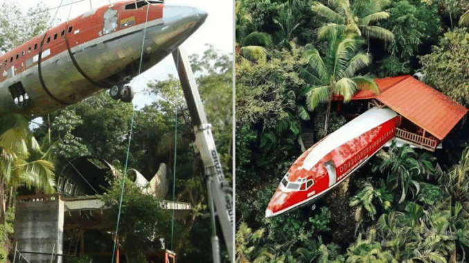 A man bought an old airplane and decided to turn it into nothing less than a hotel . First, he dismantled the airplane into parts, and the metal fuselage was transported to the tropical jungle on five trucks