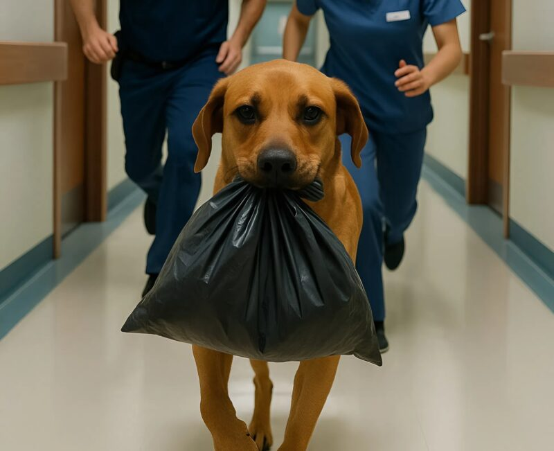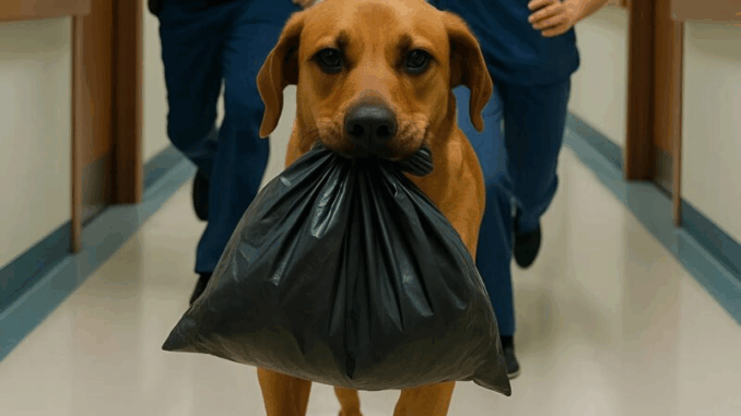 A dog ran down the hospital corridor, holding a black bag in its mouth: when the doctors finally caught up, they discovered something terrible