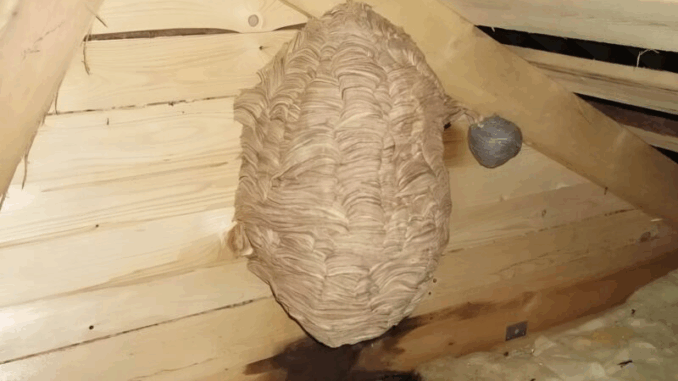Today, it happened again. But this time, the sound was more persistent, louder… and closer. I grabbed a flashlight and slowly went up. The attic was stuffy, with a strange smell – sweetish and unpleasant. Suddenly, I saw it: right on the ceiling, near the wall, hung a huge gray-yellow growth, as if made of paper, with curious circular layers. That was exactly where the sounds were coming from.