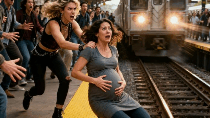 The roar of the train swallowed the air. Emma tried to push herself up, but her body refused to move. Panic surged through her chest. She curled her arms protectively around her stomach, tears blurring her vision. People on the platform shouted, but their voices felt distant—warped by terror.