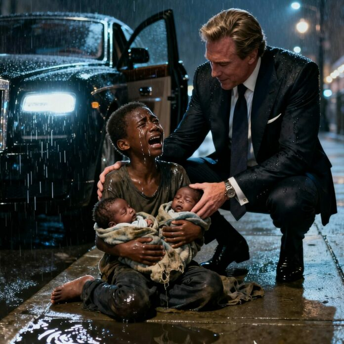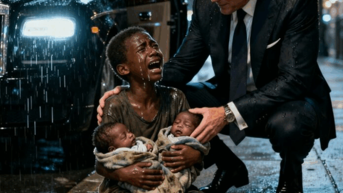 Adrian felt something he hadn’t felt in years: a pull in his chest. He lowered the window, and the roar of the rain filled the car. In that moment, he saw clearly—the “bundles” in the boy’s arms were two infants, their tiny faces red from crying, their bodies trembling with cold.