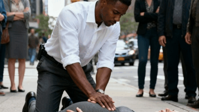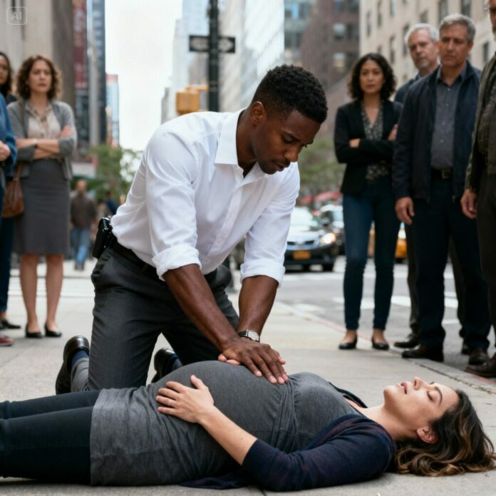 Her breathing steadied just enough. Marcus guided her onto her side to ease the pressure and gently checked for bleeding. He dialed 911 while continuing to keep her calm. People gathered, but no one stepped forward. Only Marcus stayed, hands steady, voice calm, heart racing—but controlled.