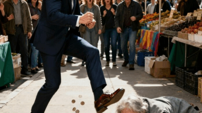 When he walked by, the woman accidentally reached toward his leg, maybe mistaking him for someone offering help. Daniel’s pride flared. Without thinking, he jerked his leg away and kicked her hand aside, muttering, “Don’t touch me.” The motion was harsher than he intended, and the woman fell backward, her cup spilling coins across the pavement.