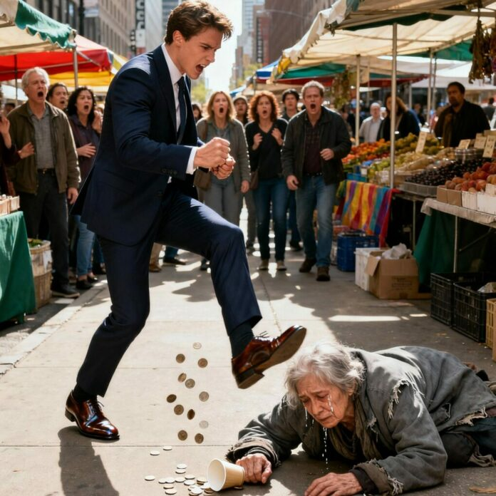 As he passed through the rows of fruit stalls, his eyes landed on an elderly woman sitting by the curb, holding a cardboard sign that read: Hungry. Please help. Her coat was torn, her hair matted with gray, and her trembling hands cupped a small paper cup half-filled with coins. Daniel frowned. He hated the sight of beggars—people who, in his mind, refused to fight for their lives.