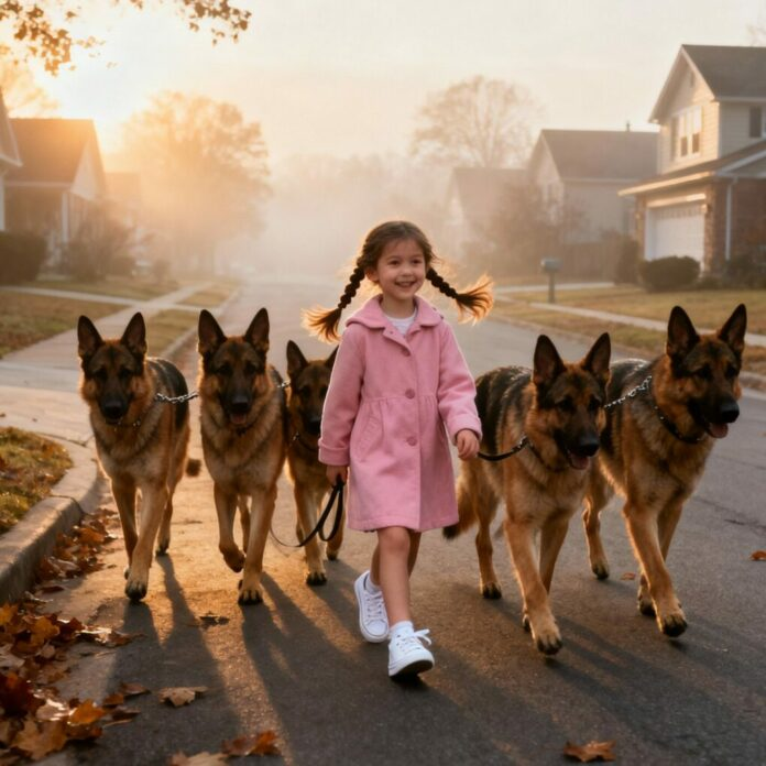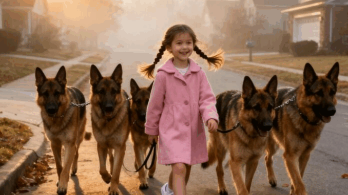 Every morning at exactly seven o’clock, the quiet neighborhood of Maple Street witnessed the same strange sight. A tiny girl, no older than six, strolled calmly down the sidewalk in her pink coat, holding five leashes attached to massive German Shepherds. The dogs moved in perfect formation—one ahead, one behind, and three flanking her sides like trained bodyguards. No adult ever accompanied her. No one knew where she came from or where she went.