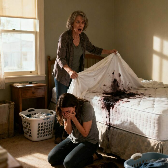 When I slipped inside the guest house, I froze. A thick, metallic smell filled the air. I stepped closer to the bed and pulled the sheet aside. What I saw made my stomach twist—dark stains, heavy and old, soaked deep into the mattress. Blood.