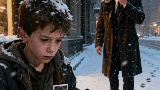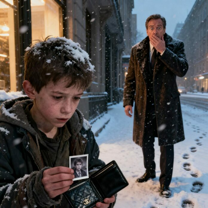 He picked it up, brushing off the snow, and glanced around. The street was busy, people rushing past, none noticing him. He opened the wallet carefully. His heart skipped a beat—not at the cash, which was plentiful, but at a photograph tucked in a hidden flap. The photo showed a small boy with strikingly familiar blue eyes, messy brown hair, and a shy smile. Jason froze. Those eyes… that smile… it was like looking in a mirror.