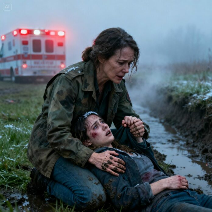 The morning fog hung low over County Road 19 when Helena Ward pulled over, drawn by the sight of something pale and still in the ditch. At first, she thought it was an animal. Then she saw the hand. The mud-caked fingers twitched weakly, and her training kicked in before her heart could catch up.