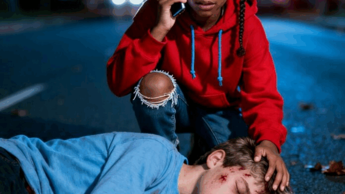 Ten minutes later, he arrived to chaos. Police lights flashed against the rain-slick pavement. A small crowd had gathered. And there — lying on the sidewalk — was Ethan, pale and unconscious, a young Black girl kneeling beside him, holding his hand.