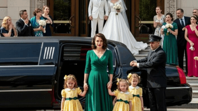 The black car rolled to a stop. The chauffeur stepped out, opening the door with practiced grace. First came three little girls in matching yellow dresses, holding hands, their curls bouncing as they walked down the red carpet. Behind them emerged Emma, wearing an elegant emerald-green gown. Her presence was commanding yet calm, her beauty radiant, and her strength undeniable.