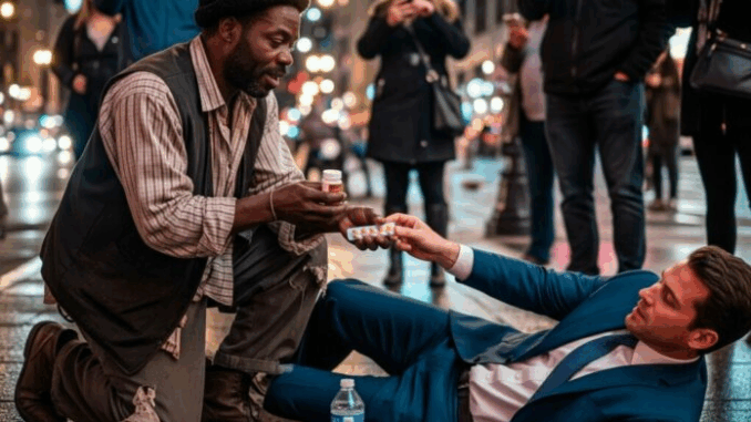 The city lights glowed above him, indifferent to his hunger. Marcus sat near a subway entrance, a paper cup at his side, when a commotion broke out on the corner. A well-dressed man in a tailored navy suit staggered, clutching his throat. His briefcase fell, scattering papers across the wet pavement.
