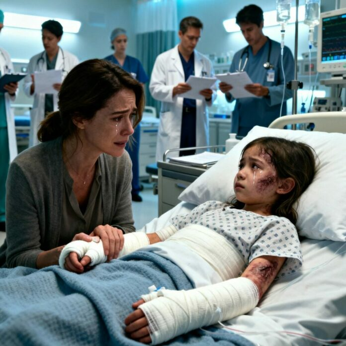 When I reached the hospital, the world felt muted, as if padded by panic. In Room 417, my eight-year-old daughter lay wrapped in layers of white bandages, her small body swallowed by wires and machines. Her cheeks were streaked with dried tears.