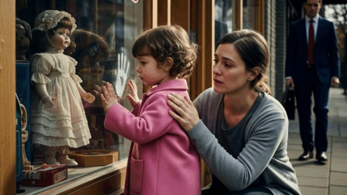 Lily peeked around Emily, hope flickering in her wide eyes. Emily hesitated, pride and necessity wrestling, but finally nodded. Inside the store, Lily wandered toward the dolls, eyes shining like a child stepping into a wonderland. She pointed at a mermaid doll with glittering scales.