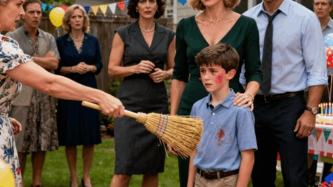 My ex-husband showed up at our son’s birthday party with his new wife. She handed my boy a broom and said, “Go help your mother clean up, that’s what you’re supposed to do.” My son looked at me, his cheeks burning with embarrassment. I didn’t say a word… not until he unwrapped his last present. And the second she saw what was inside, she went pale.