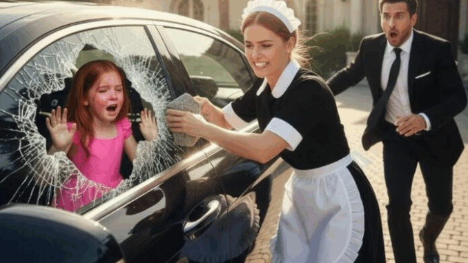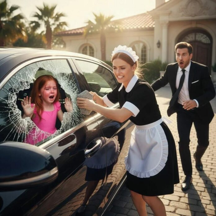 On the porch, Elena, the housemaid, carried a basket of freshly folded sheets. At first, she thought she heard the rustle of branches in the wind. Then a faint thump—then another. She turned and froze. Sophie’s small hands were pressed against the car window, her face red and tear-streaked.