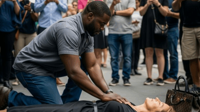 It wasn’t simple. Cell phone footage surfaced online—blurry clips showing a man with broad shoulders, bent over her, hands compressing her chest. His face, half-hidden, revealed only glimpses: dark skin, close-cropped hair, a worn shirt. Internet chatter hailed him as a hero, but no one knew his name.