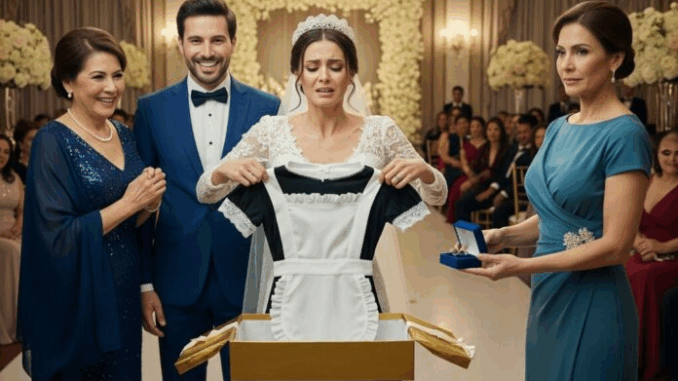 At my daughter’s wedding, her mother-in-law presented her with a gift box. When my daughter opened it, she found a housekeeping uniform inside. My son-in-law grinned and commented, “Just what she’ll need at home.” My daughter’s eyes filled with tears, and she began to tremble. I rose quietly from my seat and said, “Now, let’s see the gift I have for you.” As my daughter opened my box, the expressions on their faces turned to utter shock.