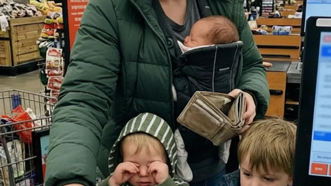 A toddler sat in the cart crying. A preschooler clung to her leg. A baby squirmed in a carrier strapped to her chest.