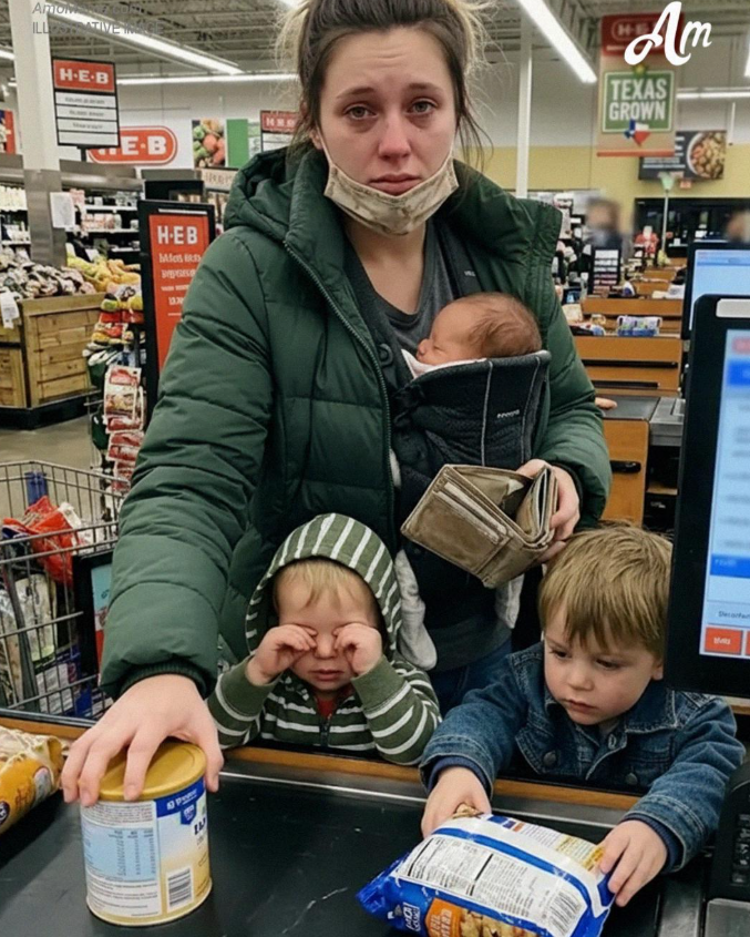 She was trying to count coins from her wallet, her face flushed, her hands shaking as she held up a single can of formula.