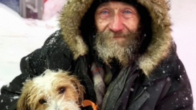 He was huddled under a threadbare blanket, his face red from the biting cold. Beside him sat a small, scruffy dog, trembling as it pressed against his side.