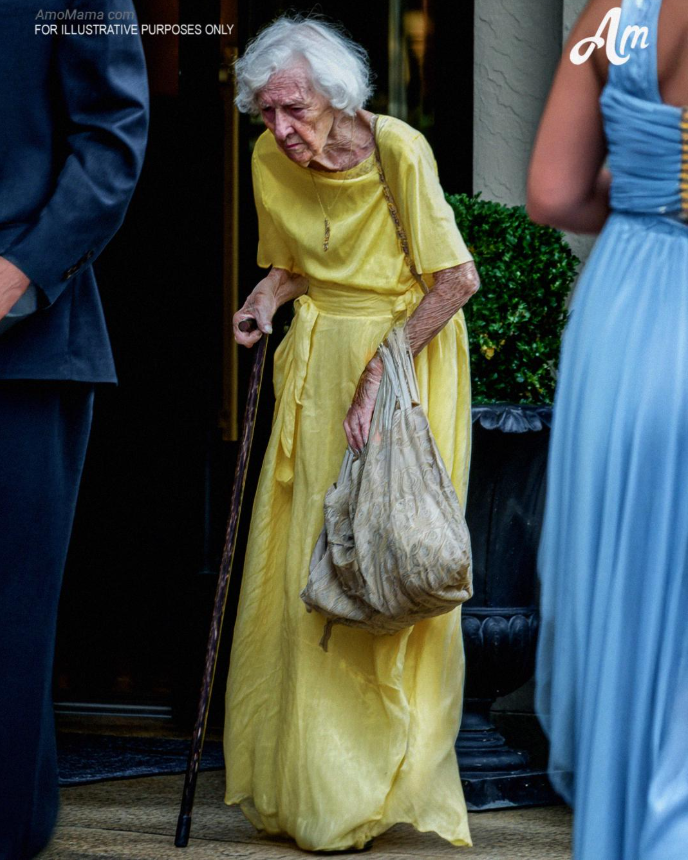 She walked slowly, wearing her old blue dress pressed neatly but visibly worn. Her hair was pinned back in a simple clip, her shoes didn’t match, and in her hands, she clutched a faded cloth bag with frayed corners and a stain near the zipper.