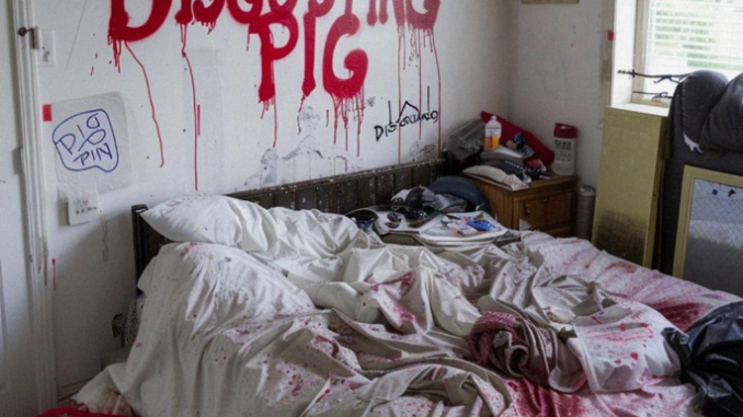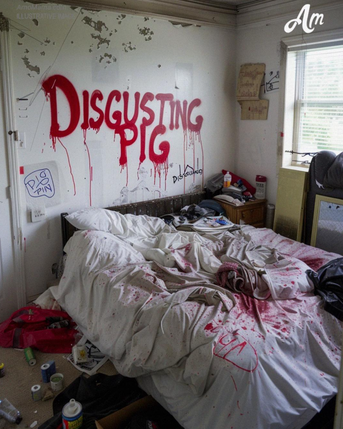 We were out of town for the weekend, our first real vacation in months. When we came back, the door was unlocked. Nothing stolen, but everything… ruined. Our bed was slashed open, furniture flipped, and my makeup was poured all over the floors. And on the walls, written in red spray paint, three words I can’t unsee: