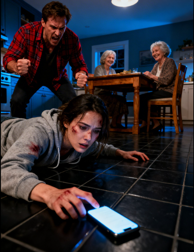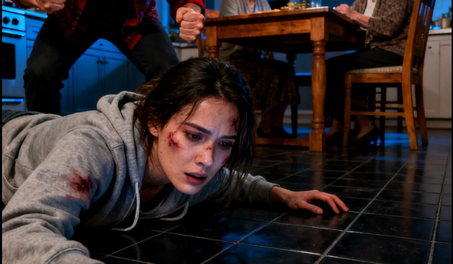 I collapsed onto the kitchen tile. The cold hit my cheek. My vision tunneled. My ribs burned as if they’d been filled with hot coals.