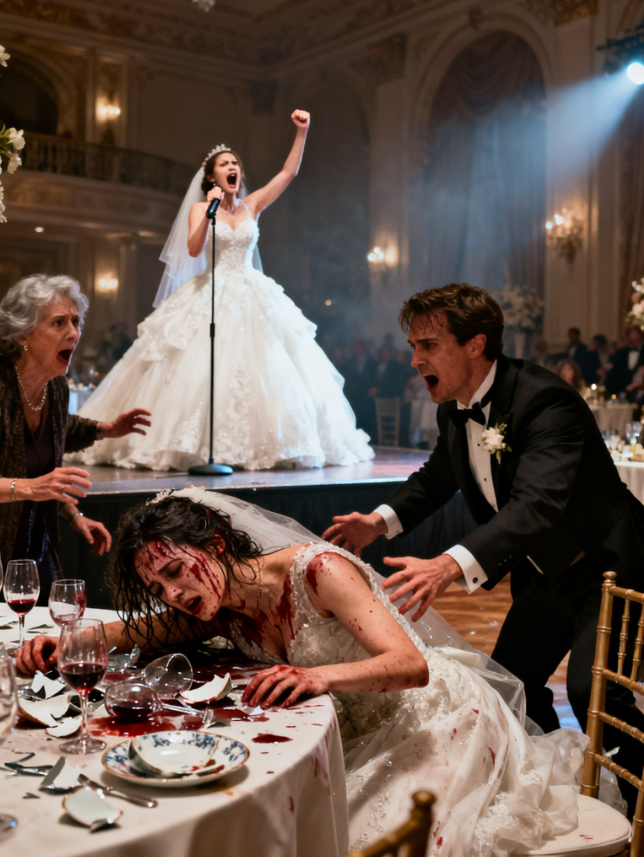 She floated from table to table, laughing too loudly, touching her belly in a way that looked practiced even though there was nothing there. She posed for photos with her hand on her hip, chin lifted, train spread out behind her like she was the bride.